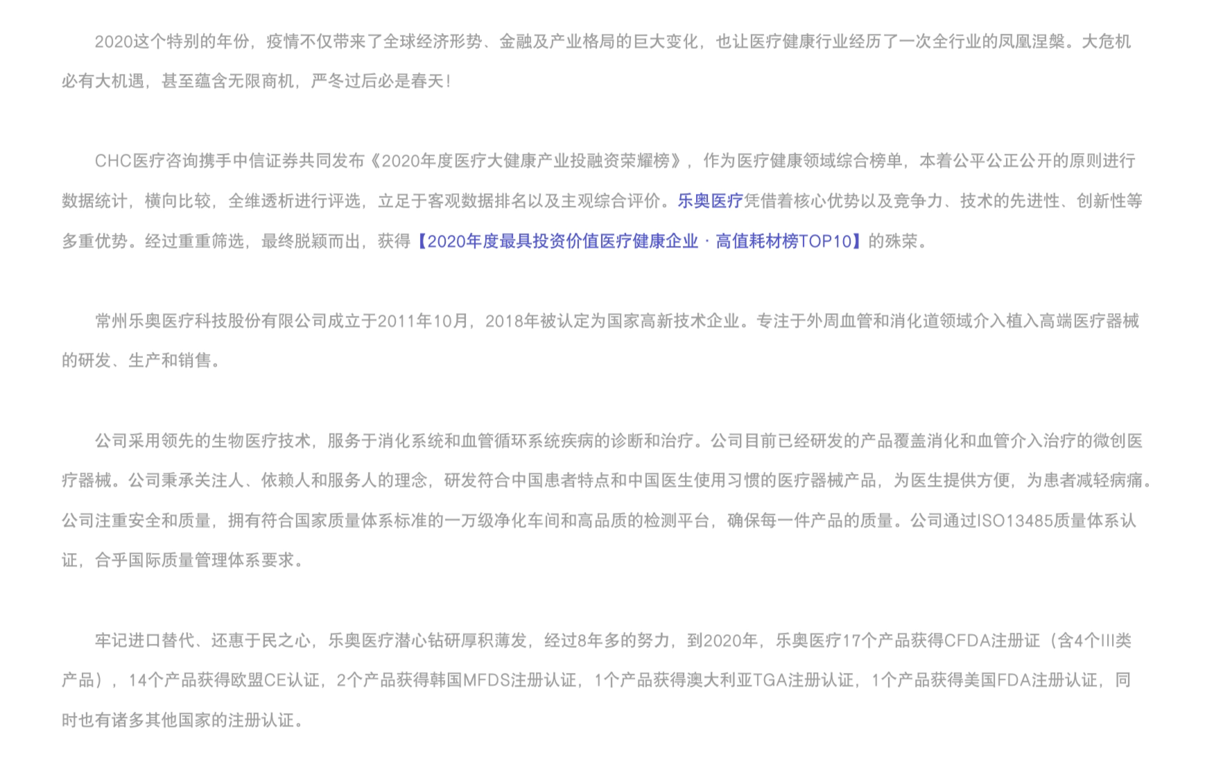 樂奧醫療榮登「2020年度最具投資價值醫療健康企業·高值耗材榜TOP10」榜單